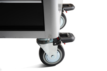 Verktygsvagn i stabil dubbelväggs konstruktion av stål. Lådorna är fullt utdragbara med kraftiga, 46mm, kullagrade skenor. För att förhindra att vikten av verktygen får skåpet tippar framåt